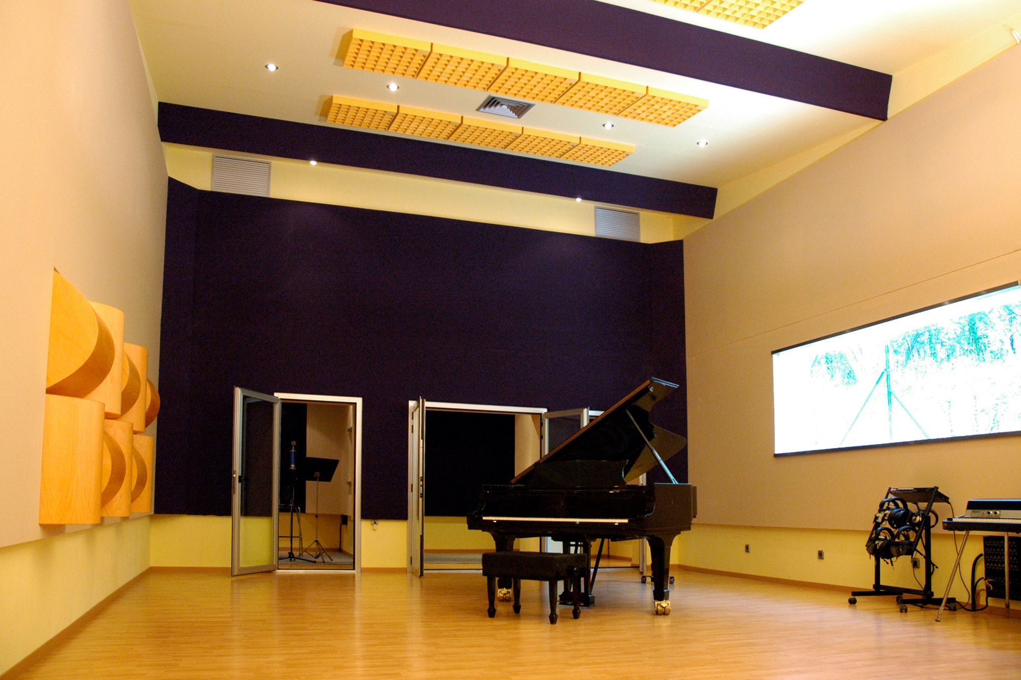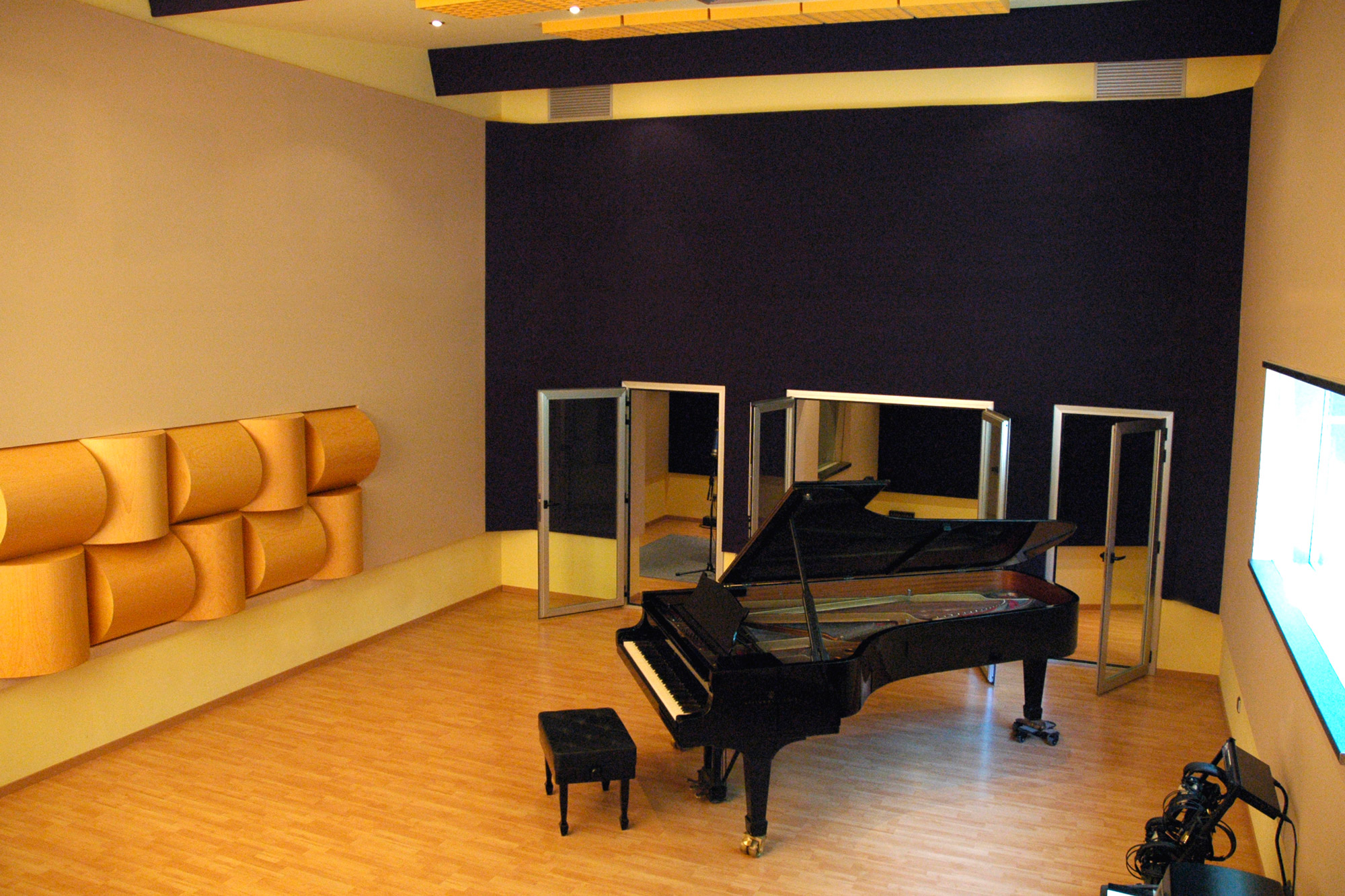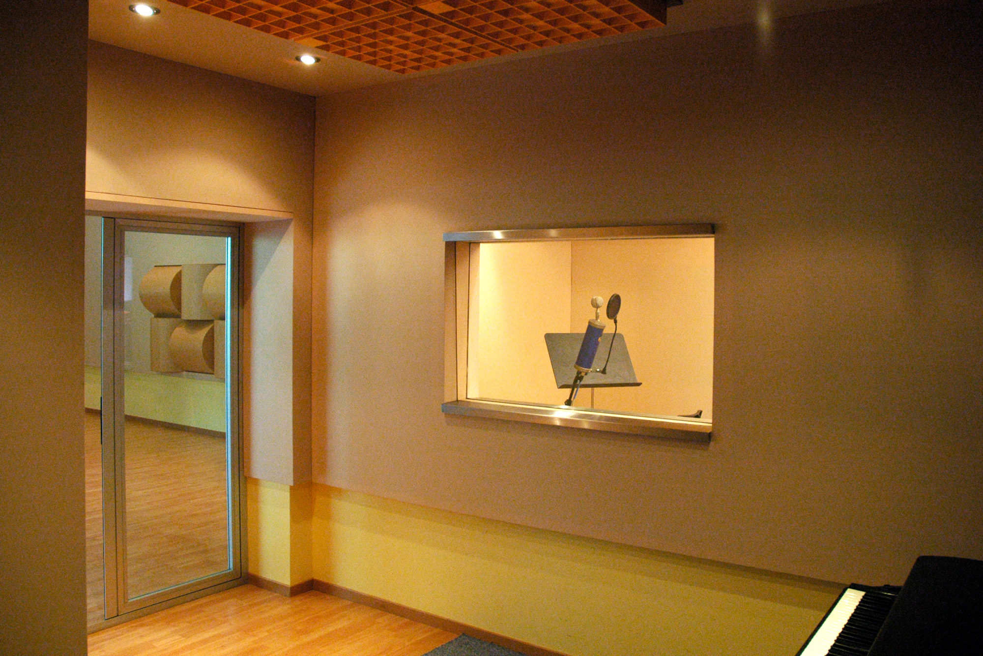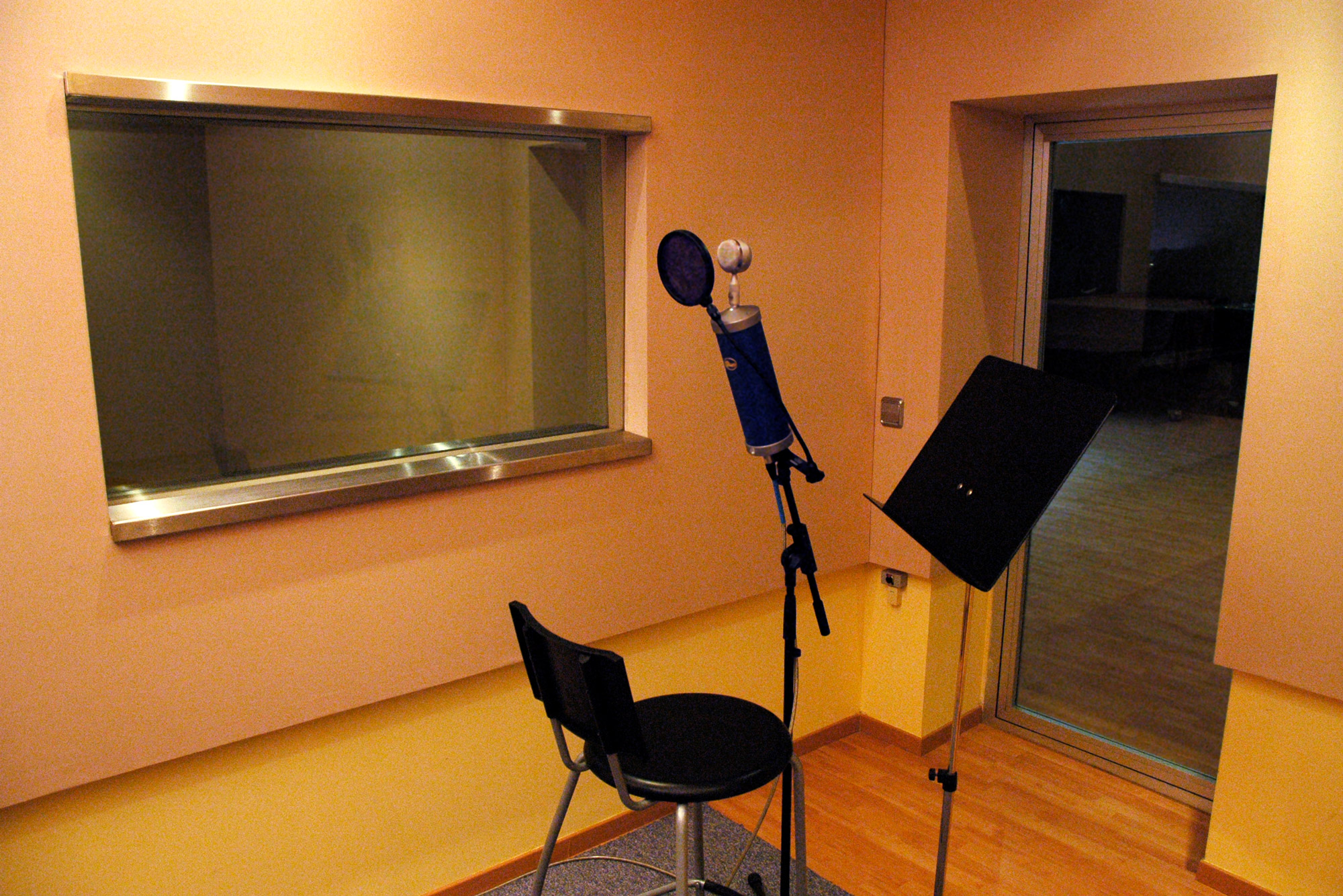 Un gran ventanal proporciona luz y una magnífica vista a toda la vegetación del bosque vecino. El diseño acústico ha sido realizado desde cero por el diseñador acústico Benjamín González de la empresa Audiosíntesis, sin ninguna limitación de espacio. La sala está equipada con difusores acústicos de la marca RPG. El resultado es una sala muy agradable para trabajar, gracias tanto a la luz natural como a las dimensiones y con una acústica excelente para realizar desde grabaciones clásicas (orquestas de cámara, corales..) como estilos más modernos (big bands, jazz, blues, pop-rock, etc.) Las tres salas están comunicadas entre ellas y con la sala grande mediante visores y puertas de cristal. Están tratadas con difusores RPG y van desde la acústica más viva de la sala mayor hasta el ambiente acústico más seco de la más pequeña.