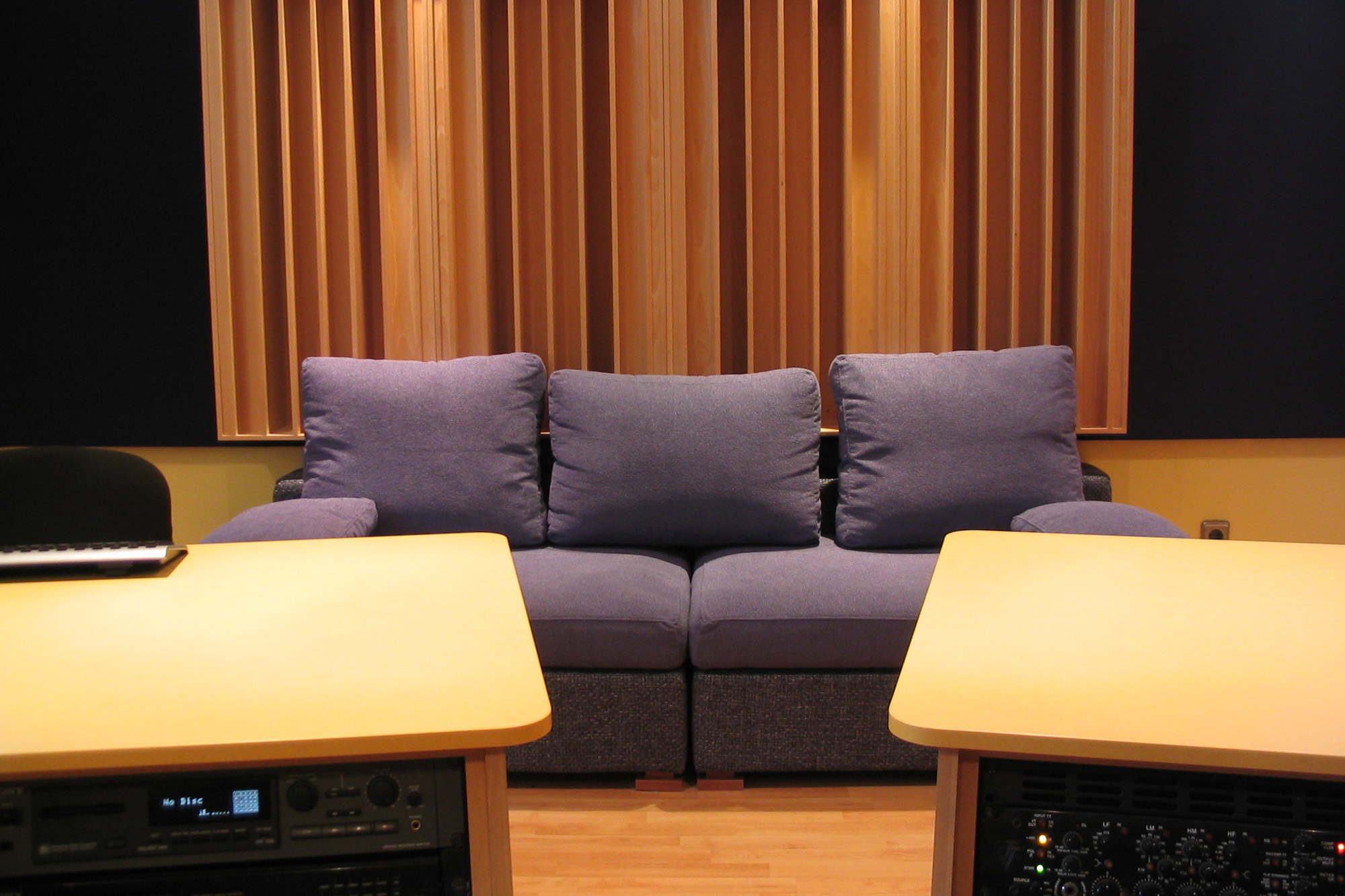 La sala de control, de 55 m², dispone de luz natural y climatización. Todo el tratamiento acústico se realiza con difusores de la marca RPG. El hecho de que se trate de una nueva construcción especialmente diseñada para convertirse en estudio de grabación, ha dado como resultado una sala con unas condiciones acústicas óptimas.