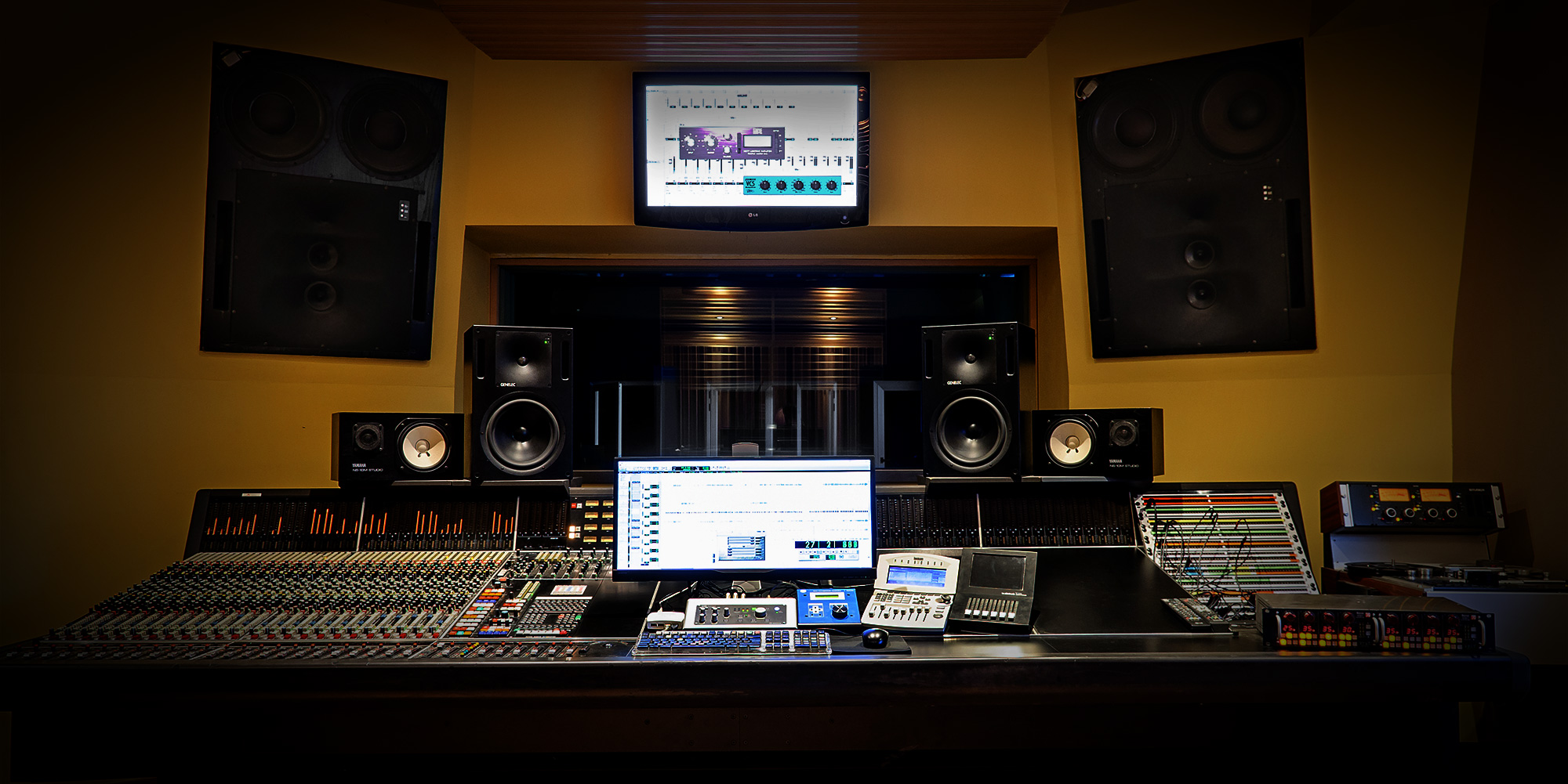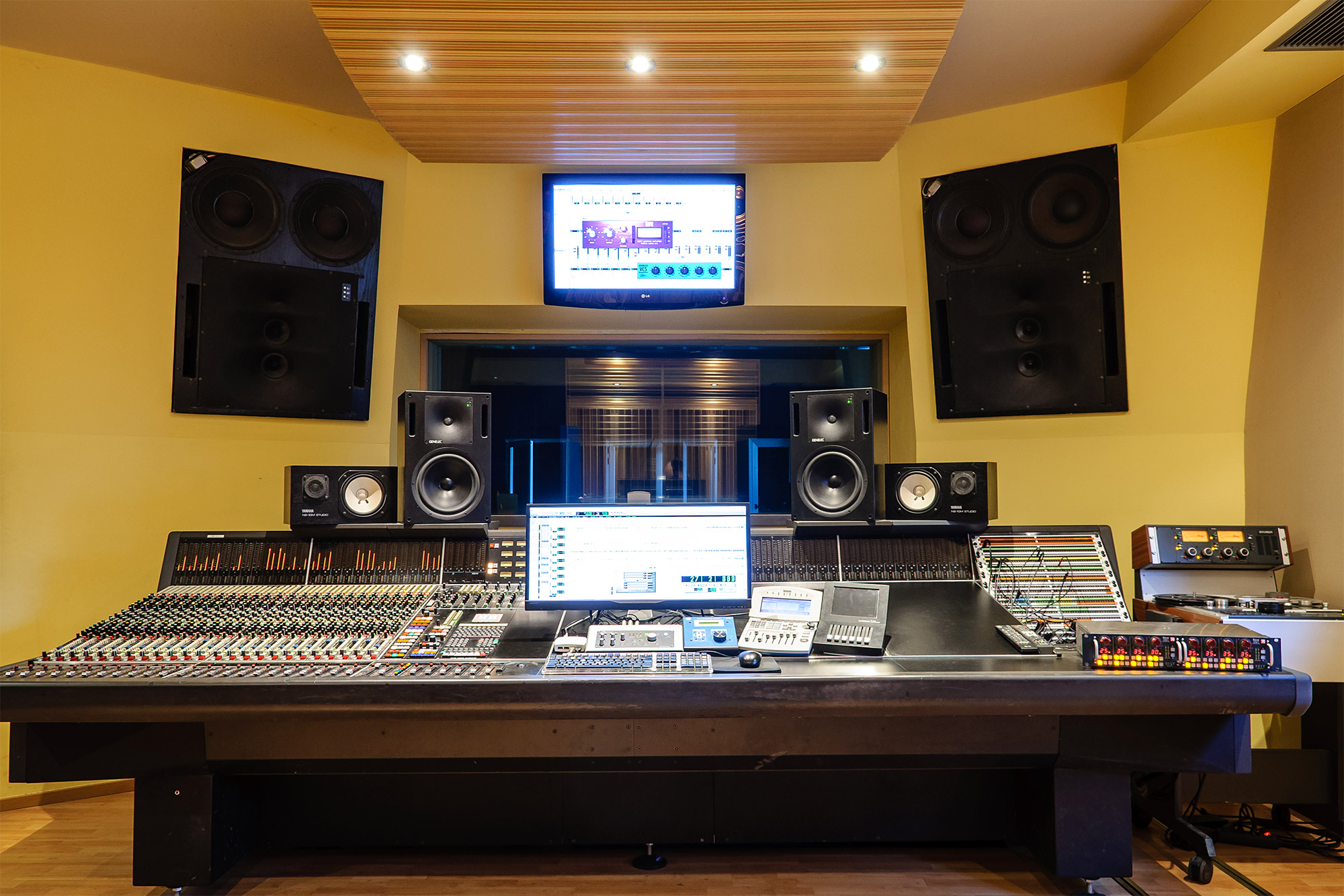 El monitoraje principal se realiza con unos Genelec1035A que combinados con la excelente sonoridad del estudio permiten obtener un entorno acústico máximo nivel a la hora de realizar las mezclas. Este estudio está completamente equipado para realizar mezclas en 5.1, tanto para cine como para DVD’s musicales.